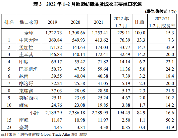 另2022年1-2月歐盟自越南進口紡織品及成衣總值7.39億美元,占比3.2%,較上年同期成長18.4%,越南為第6大進口來源;中國臺灣地區(qū)則為第23大進口來源,占比0.4%,成長31.9%。(詳表三)