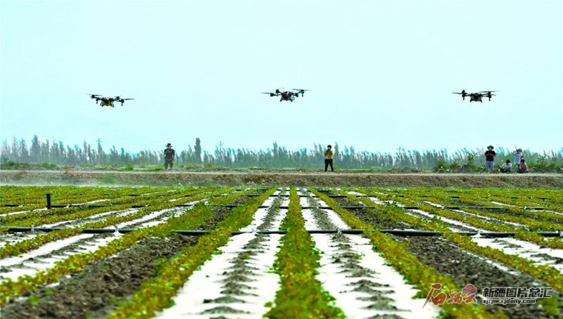 5月11日,技術(shù)員操作無人機在庫爾勒市哈拉玉宮鄉(xiāng)一處棉田噴灑防蟲害藥物。目前,巴音郭楞蒙古自治州300余萬畝棉花陸續(xù)進入幼苗管護期,棉農(nóng)搶抓農(nóng)時對棉田開展田間管理。