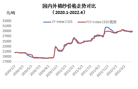 本月內(nèi)外棉紗價格均有所下跌,國產(chǎn)32支純棉紗4月均價28715元/噸,較上月下降254元,跌幅0.88%,較去年同期上漲4363元,漲幅17.9%;進口32支純棉紗4月均價28989元/噸,較上月下降163元,跌幅0.56%,較去年同期上漲4600元,漲幅18.9%。
