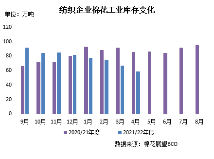 由于紡紗利潤持續(xù)虧損,疊加疫情管控和下游需求不佳,企業(yè)對高價原料的采購意愿持續(xù)較弱,原料庫存繼續(xù)回落。截至4月30日,紡織廠在庫棉花工業(yè)庫存量58.43萬噸,較上月底減少8.02萬噸,同比減少27.2萬噸。其中42%企業(yè)減少棉花庫存,18%增加,40%基本保持不變。