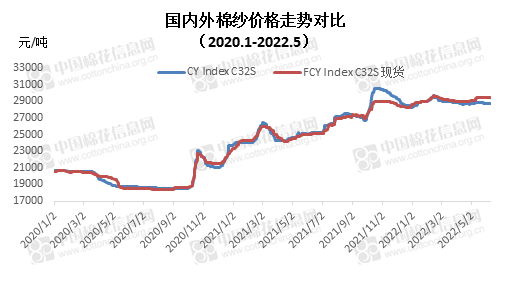 本月內(nèi)外棉紗均價上漲,國產(chǎn)32支純棉紗5月均價28808元/噸,較上月上漲93元,漲幅0.32%,較去年同期上漲3841元,漲幅15.4%;進口32支純棉紗5月均價29342元/噸,較上月上漲353元,漲幅1.22%,較去年同期上漲4510元,漲幅18.9%。