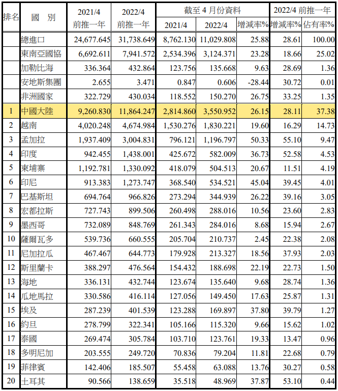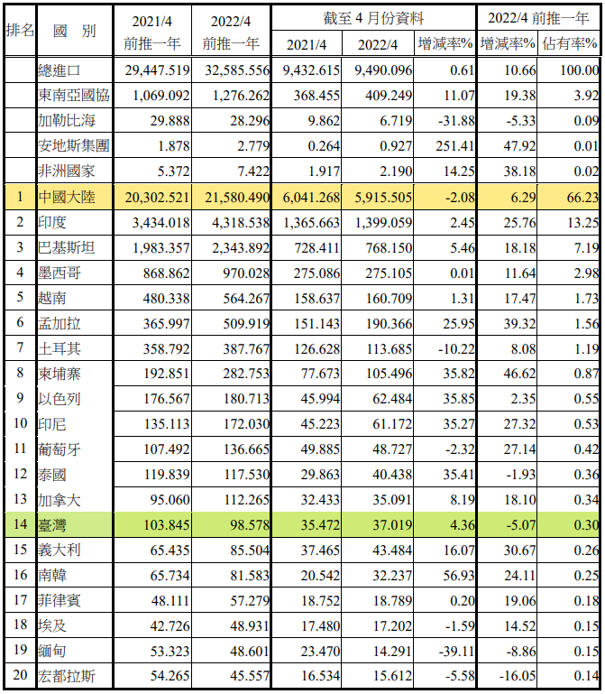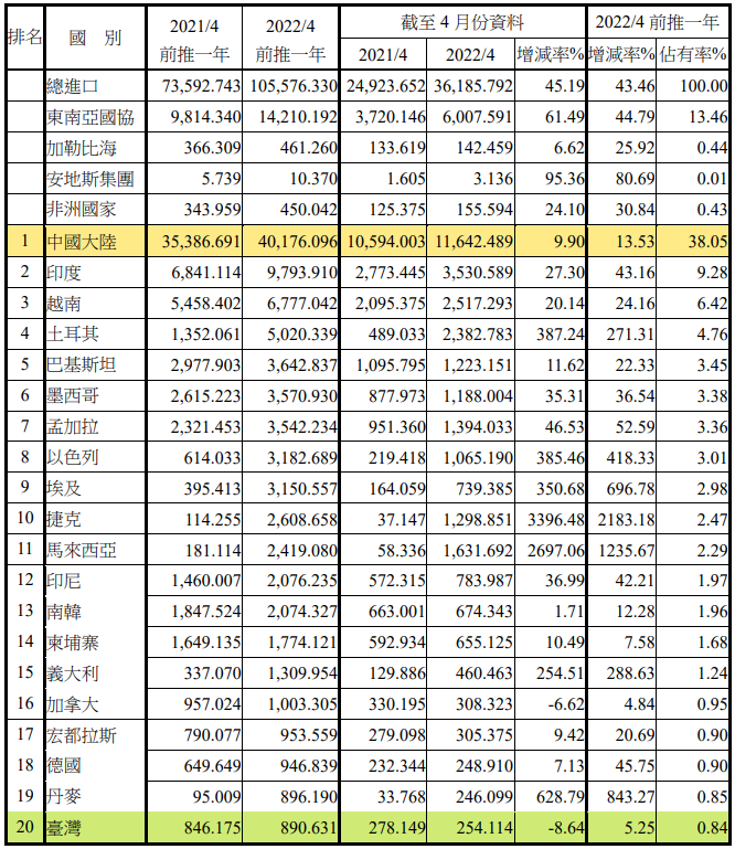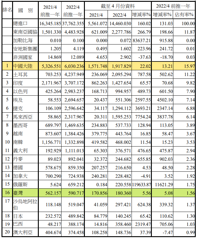 注:依2022年4月前推一年進口占有率排序