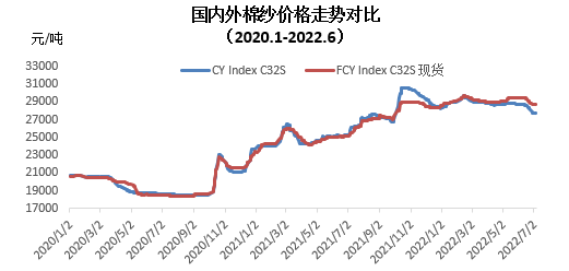 本月內(nèi)外棉紗價(jià)格有所下跌,國(guó)產(chǎn)32支純棉紗6月均價(jià)28412元/噸,較上月下降396元,跌幅1.37%,較去年同期上漲3221元,漲幅12.8%;進(jìn)口32支純棉紗6月均價(jià)29211元/噸,較上月下降131元,跌幅0.45%,較去年同期上漲4136元,漲幅16.5%。