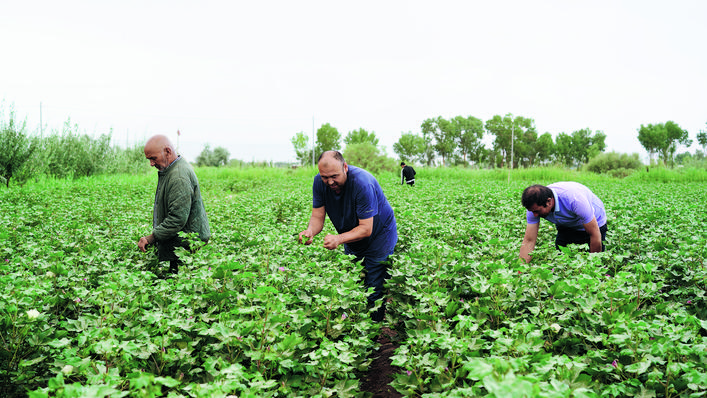 7月17日,在柯坪縣阿恰勒鎮(zhèn)庫(kù)木魯克村的棉田里,棉農(nóng)力提普·熱克普在縣農(nóng)業(yè)技術(shù)推廣中心技術(shù)員的指導(dǎo)下,一邊給棉花打頂,一邊聆聽(tīng)技術(shù)人員講解棉花病蟲害防治要領(lǐng)。
