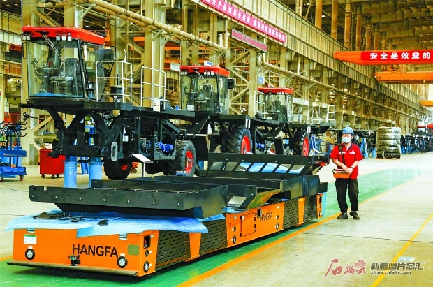 8月4日,鐵建重工新疆有限公司員工在生產(chǎn)車間轉運采棉機大型部件。目前,該企業(yè)正加緊生產(chǎn)訂單產(chǎn)品,確保順利完成年度任務。