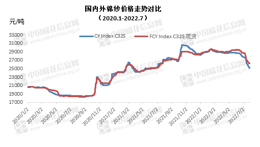 7月,國產(chǎn)32支純棉紗均價26485元/噸,較上月下降1927元/噸,跌幅6.78%,較去年同期上漲281元/噸,漲幅1.07%;進(jìn)口32支純棉紗均價27341元/噸,較上月下降1870元/噸,跌幅6.4%,較去年同期上漲1418元/噸,漲幅5.47%。
