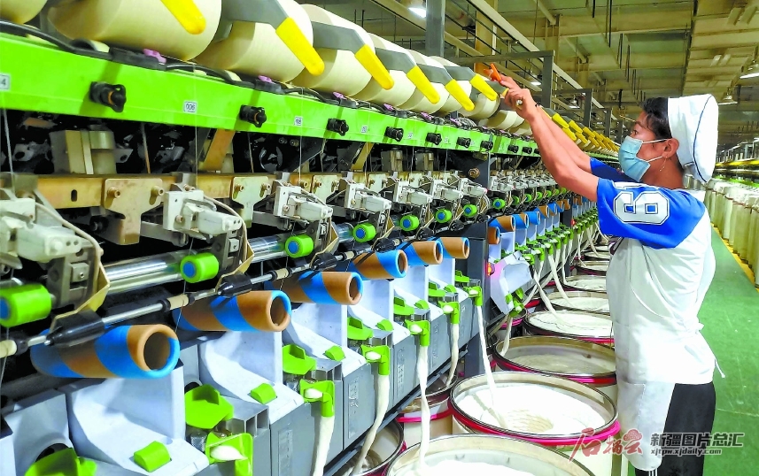 8月22日,工人在阿瓦提縣幸福創(chuàng)業(yè)園的阿克蘇普美紡織科技有限公司紡織車間進(jìn)行紡織作業(yè)。