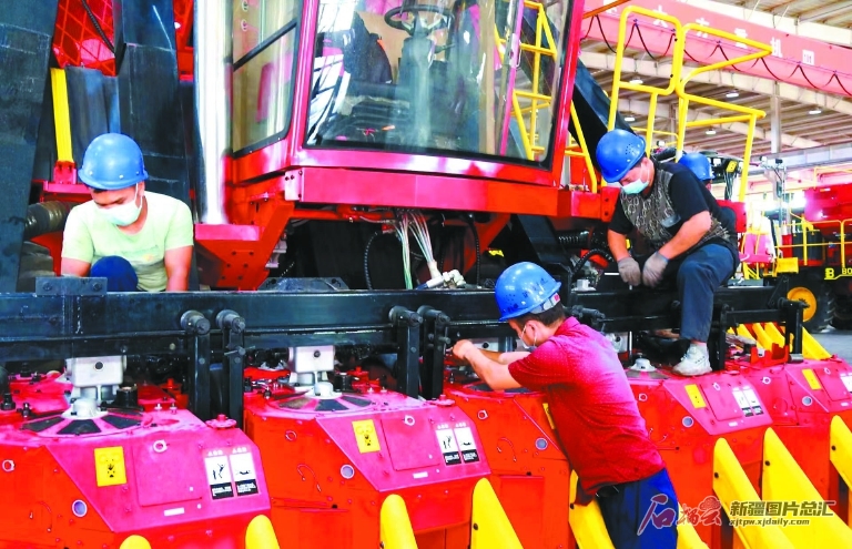 8月16日,沙雅缽施然智能農(nóng)機(jī)有限公司的工作人員正在組裝采棉機(jī)。該公司主要產(chǎn)品有采棉機(jī)、播種機(jī)、聯(lián)合整地機(jī)、殘膜回收機(jī)、噴藥機(jī)等涵蓋棉花全產(chǎn)業(yè)鏈的機(jī)械化作業(yè)設(shè)備。