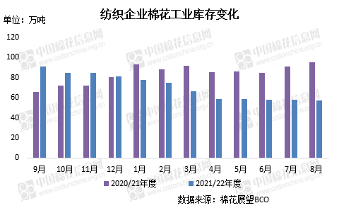 本月棉企積極銷售,下游雖出現(xiàn)好轉(zhuǎn),但市場上棉花供應(yīng)充足,需求仍弱勢,疊加新棉開秤在即,謹(jǐn)慎情緒增加。紡織廠多仍維持隨用隨買的策略,將原料庫存維持在低位。截至8月31日,紡織廠在庫棉花工業(yè)庫存量57.32萬噸,較上月底減少0.49萬噸,同比減少38.23萬噸。其中28%企業(yè)減少棉花庫存,25%增加庫存,47%基本保持不變。
