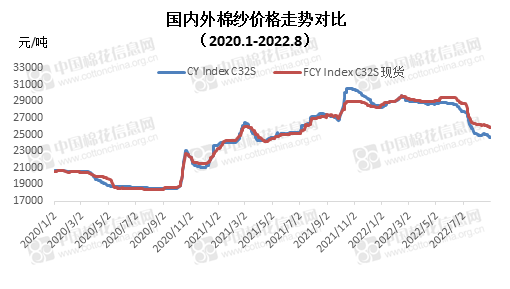 本月內(nèi)外棉紗價格均繼續(xù)下跌,國產(chǎn)32支純棉紗8月均價24941元/噸,較上月下降1544元,跌幅5.83%,較去年同期下降2421元,跌幅8.85%;進(jìn)口32支純棉紗8月均價26125元/噸,較上月下降1216元,跌幅4.44%,較去年同期下跌908元,跌幅3.36%。