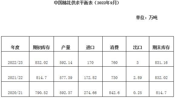 8月,據中國棉花協會調查,2022/23年度全國植棉面積4346.7萬畝,同比持平略增,預計總產量約592.1萬噸,同比增長2.6%,盡管部分棉區(qū)出現不利天氣,但對單產影響不大。分區(qū)域看:新疆棉花生長處花鈴后期和吐絮盛期,整體長勢好于去年,預計總產545.3萬噸,同比增長3.4%,占全國總產量的92.4%;黃河流域棉區(qū)8月雨水偏多,爛鈴有所增加,但仍少于去年,總體病蟲害均較輕發(fā)生,預計總產24.3萬噸,同比下降15.4%;長江流域棉區(qū)氣候干旱,導致蓋頂桃少,吐絮不暢,棉籽成熟度不高,落花落鈴嚴重,但并未出現爛鈴,對產量的影響還要看后期恢復情況,預計該棉區(qū)產量18.1萬噸,同比增長0.5%。