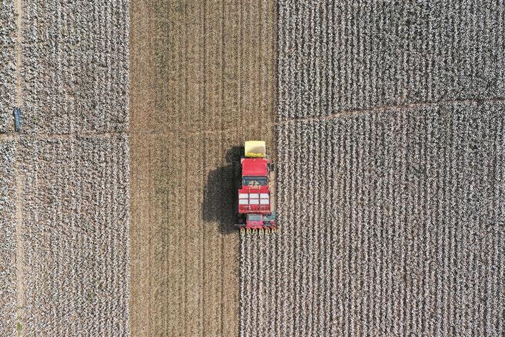 9月22日,七師一二九團(tuán)七連的一片棉田里,采棉機(jī)正在作業(yè)。當(dāng)前,七師胡楊河市近200萬(wàn)畝棉花陸續(xù)進(jìn)入采摘期,該師市統(tǒng)籌抓好疫情防控和農(nóng)業(yè)生產(chǎn),科學(xué)調(diào)配采棉機(jī)械,細(xì)化各項(xiàng)保障措施,確保新棉采收順利進(jìn)行。
