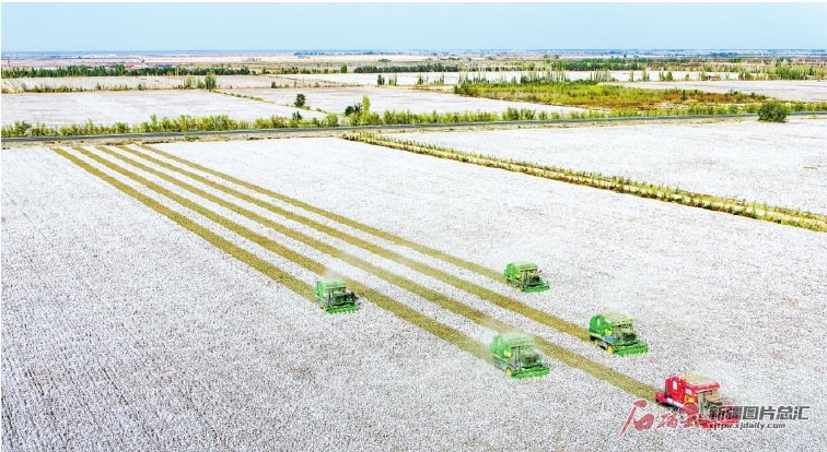 10月7日,在昌吉國家農(nóng)業(yè)高新技術(shù)產(chǎn)業(yè)示范區(qū)優(yōu)質(zhì)棉種植基地,裝有北斗導(dǎo)航系統(tǒng)的采棉機在棉田作業(yè)。目前,該示范區(qū)種植的10萬畝優(yōu)質(zhì)棉已采收3萬余畝。