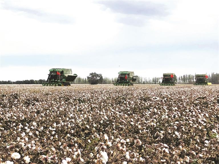 9月27日,瑪納斯縣樂土驛鎮(zhèn)文家莊村,幾臺大型采棉機正在田間作業(yè)。據了解,樂土驛鎮(zhèn)今年種植棉花10萬余畝,目前已陸續(xù)開始采收。