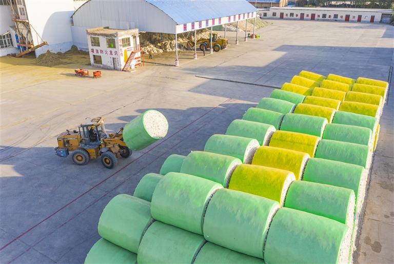 10月4日,呼圖壁縣五工臺鎮(zhèn)云龍棉業(yè)集團有限公司,工人在用鏟車搬運棉包。連日來,呼圖壁縣廣大棉農(nóng)搶抓晴好天氣,加緊銷售新棉。當?shù)孛藁ㄊ召徠髽I(yè)也做好各項準備,相繼開秤確保今年棉花收購順利進行,預計11月下旬完成收購。