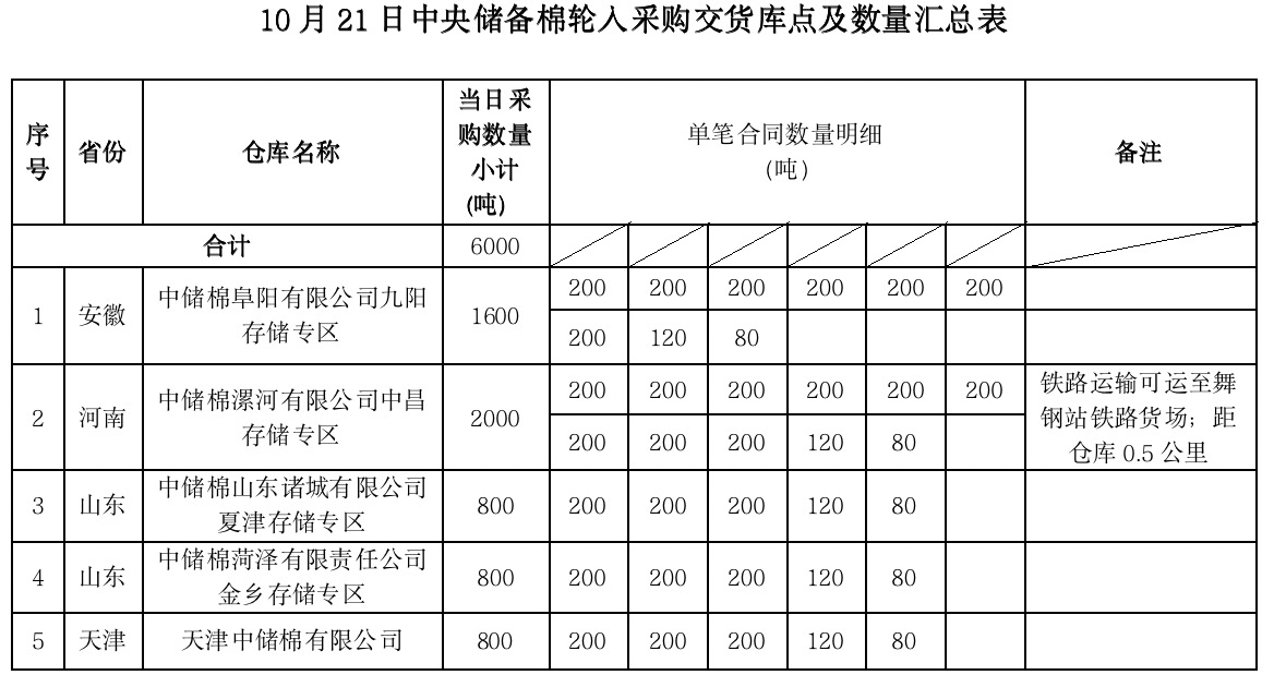 中國儲備棉管理有限公司定于2022年10月21日采購棉花6000噸(公定重量)。具體庫點及數(shù)量如下: