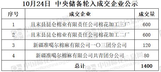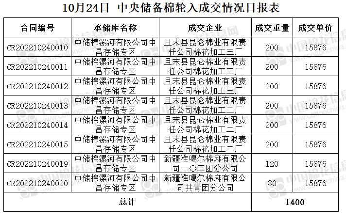 10月24日,中國儲備棉管理有限公司掛牌采購棉花6000噸(公定重量),實際成交1400噸,成交率23%,成交均價15876元/噸,成交最高價15876元/噸,成交最低價15876元/噸。