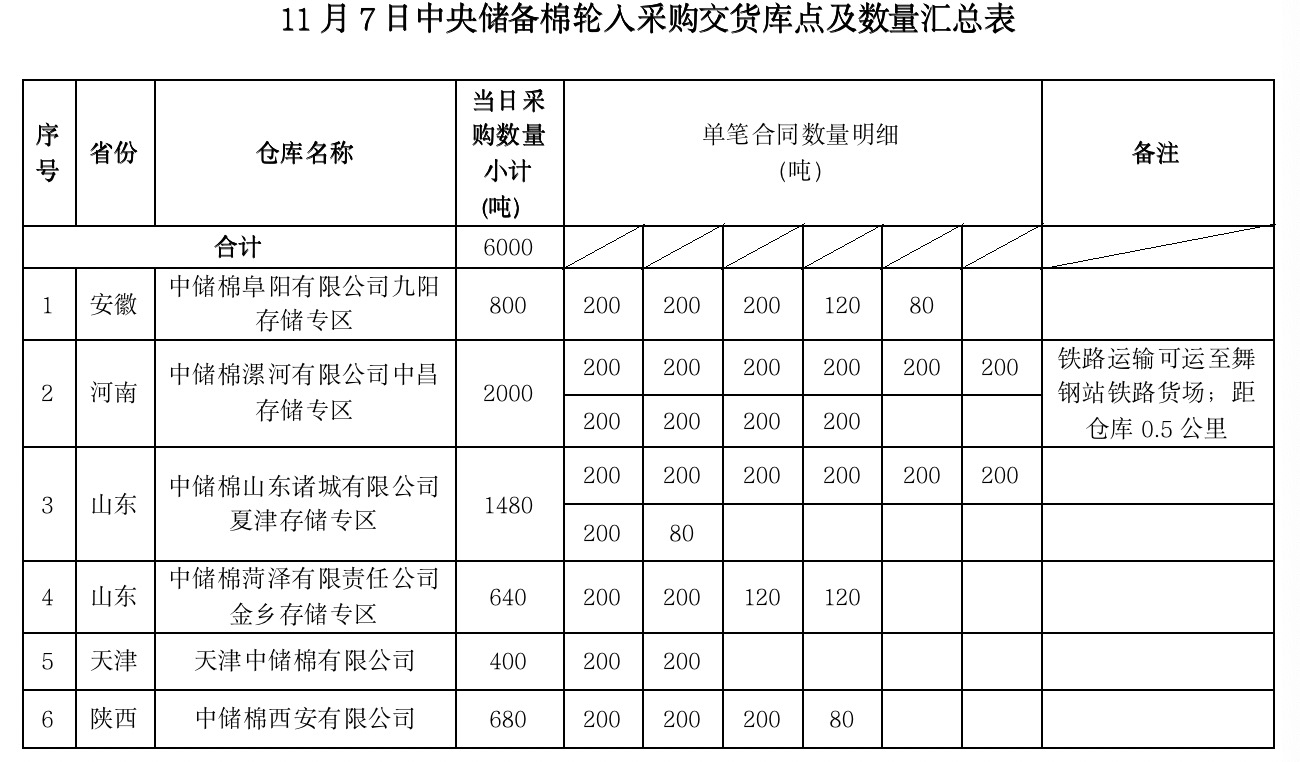 中國儲備棉管理有限公司定于2022年11月7日采購棉花6000噸(公定重量)。具體庫點及數量如下: