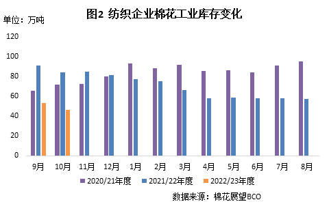 本月棉花出疆發(fā)運(yùn)仍然困難,內(nèi)地的新疆棉價(jià)格堅(jiān)挺,同時(shí)終端需求不佳,紡織企業(yè)原料采購(gòu)仍以剛需為主,庫(kù)存繼續(xù)下降。截至10月31日,紡織企業(yè)在庫(kù)棉花工業(yè)庫(kù)存量為46.51萬(wàn)噸,較上月底減少7.05萬(wàn)噸,同比減少37.94萬(wàn)噸。其中:39%的企業(yè)減少棉花庫(kù)存,23%增加庫(kù)存,39%基本保持不變。