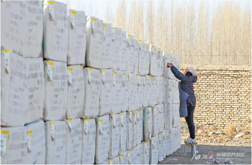位于精河縣阿合其農場惠農軋花廠,員工在皮棉包上貼標簽(12月7日攝)。隨著棉花采收結束,精河縣各棉花加工企業(yè)開足馬力忙生產,保質保量完成棉花加工生產。