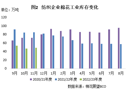 本月隨著新花大量上市,紗廠季節(jié)性補庫意愿增強,但新疆受疫情影響運輸困難,內(nèi)地庫資源偏緊、價格持續(xù)上漲,導(dǎo)致紗廠實際采購有限。截至11月30日,紡織廠在庫棉花工業(yè)庫存量48.49萬噸,較上月底增加1.98萬噸,同比減少36.48萬噸。其中26%企業(yè)減少棉花庫存,37%增加庫存,37%基本保持不變。