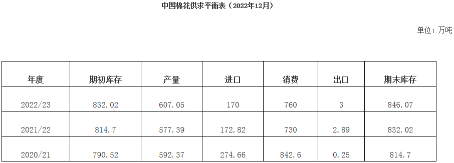 11月,國內(nèi)消費市場恢復(fù)緩慢,國際貨幣政策收縮預(yù)期持續(xù),大宗商品下行壓力加大,內(nèi)需、外需普遍偏弱。國內(nèi)新棉交售接近尾聲,加工量環(huán)比增加,棉市供應(yīng)充足。紡織市場處淡季,新增訂單不足,開機率和紡織品產(chǎn)量均下降,原料采購按需購買,棉花商業(yè)庫存大幅增加。國內(nèi)棉價維持弱勢運行,月末創(chuàng)年度新低,內(nèi)外棉價差再度擴大。據(jù)中國棉花協(xié)會預(yù)計:2022/23年度我國棉花消費量、進口量、出口量分別760萬噸、170萬噸和3萬噸,與上期相同;由于單產(chǎn)不及預(yù)期,全國棉花總產(chǎn)量607.05萬噸,較上期下調(diào)0.63萬噸,同比增長5.1%;期末庫存相應(yīng)調(diào)整846.07萬噸,同比增長1.7%。