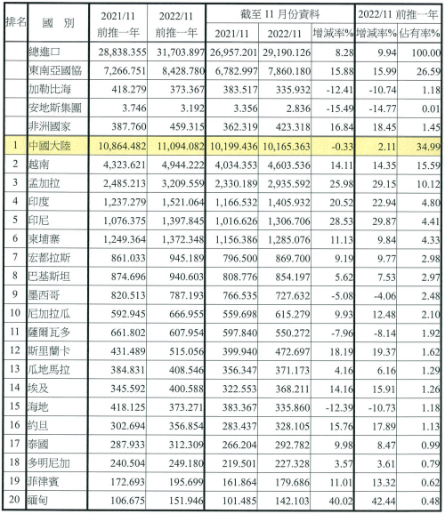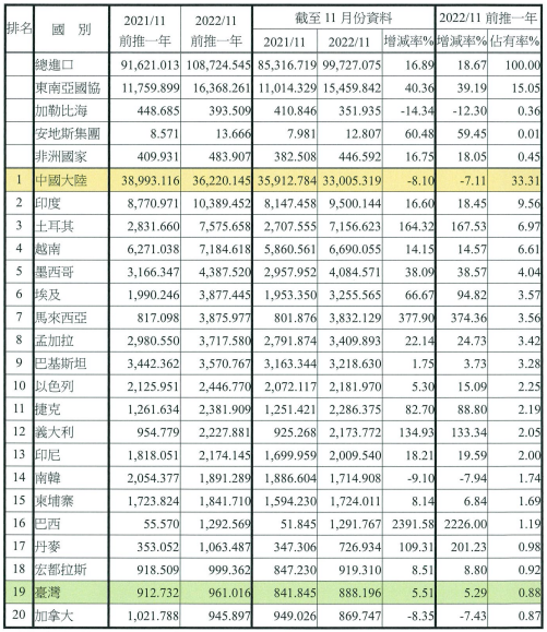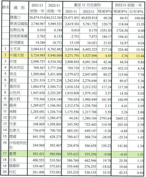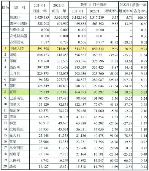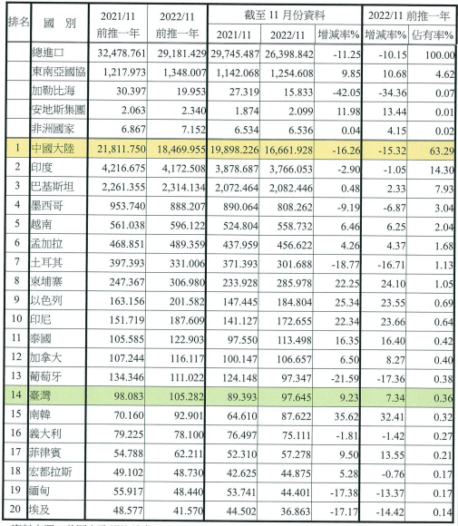 注:依2022年11月前推一年進口占有率排序