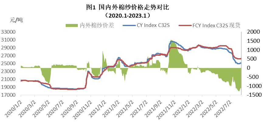本月內(nèi)外棉紗價格均出現(xiàn)上漲,國產(chǎn)32支純棉紗1月均價23351元/噸,較上月上漲598元,漲幅2.63%,較去年同期下降5432元,跌幅18.9%;進口32支純棉紗1月均價23987元/噸,較上月上漲100元,漲幅0.42%,較去年同期下降4919元,跌幅17.02%。
