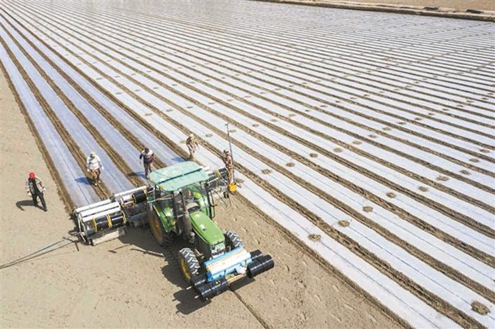 “干播濕出”技術(shù)的大面積推廣,提高棉花保苗率,實現(xiàn)苗齊苗壯苗勻,推進(jìn)棉花生育進(jìn)程。此外,南疆師市還大力推廣應(yīng)用節(jié)水降鹽技術(shù),推廣降密塑形和新型覆膜技術(shù),塑造合理株型,優(yōu)化群體結(jié)構(gòu),增強減災(zāi)防災(zāi)能力,提高出苗率。