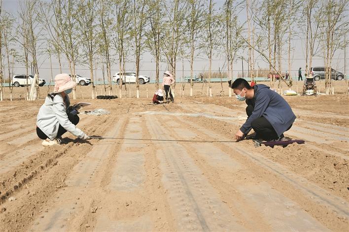 三師五十三團金胡楊鎮(zhèn)十七連棉花采用“干播濕出”種植技術(shù),農(nóng)業(yè)技術(shù)專家在測量行間距(攝于2022年4月8日)。