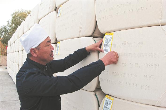 準(zhǔn)噶爾棉麻有限公司新湖三場分公司經(jīng)理高明錄在檢查棉花追溯碼標(biāo)簽封貼情況(攝于2022年10月20日)。