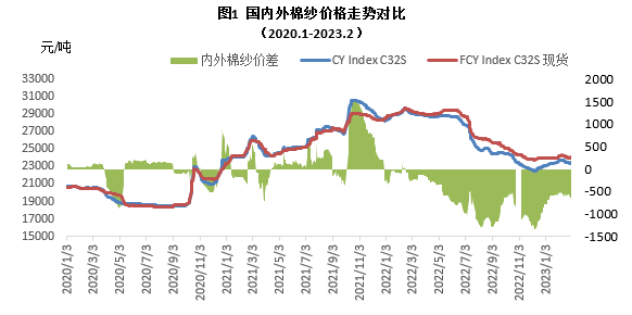 本月內(nèi)外棉紗價格均有所回落,但月度均價較上月上漲。純棉紗KC32S和精梳JC40S月末成交價23385元/噸和25760元/噸,較上月末分別下跌215元和180元。國產(chǎn)32支純棉紗2月均價23591元/噸,較上月上漲240元/噸,漲幅1.03%,較去年同期下跌5792元,跌幅19.7%;進口32支純棉紗2月均價24161元/噸,較上月上漲174元,漲幅0.73%,較去年同期下跌5320元,跌幅18.05%。