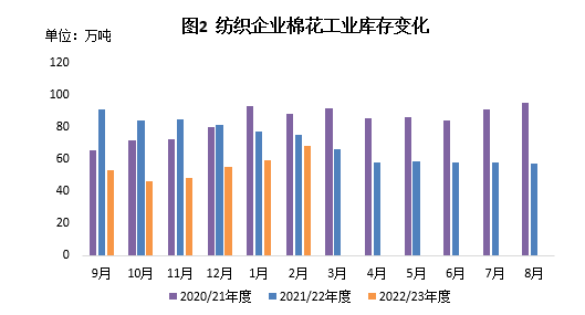 本月市場總體預(yù)期向好,紗廠由于原料庫存相對低位,季節(jié)性補庫意愿有所增強。截至2月28日,紡織廠在庫棉花工業(yè)庫存量68.62萬噸,較上月底增加9.3萬噸,同比減少9.01萬噸。其中25%企業(yè)減少棉花庫存,39%增加庫存,36%基本保持不變。