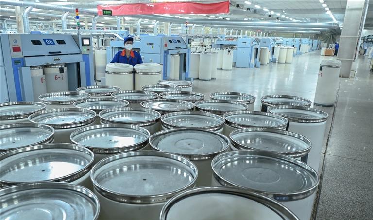 在紡織車間,工人們正在檢查紡紗質(zhì)量。