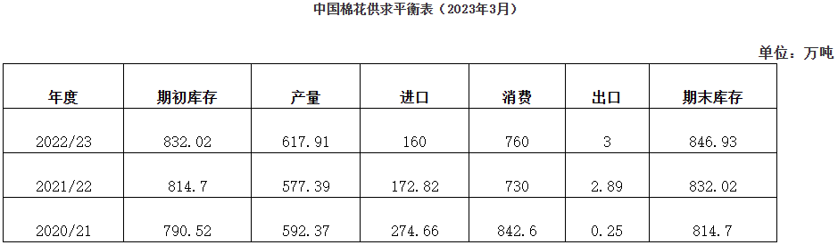 2月,隨著疫情防控較快平穩(wěn)轉(zhuǎn)段,穩(wěn)經(jīng)濟政策的效果持續(xù)顯現(xiàn),我國經(jīng)濟運行整體呈企穩(wěn)回升態(tài)勢,行業(yè)信心有所增強,紡織廠開機率攀升,紡織品銷售順暢,但因價格較低而利潤不佳。國內(nèi)棉花加工仍在進行,市場供應寬松,受期貨價格震蕩下跌影響國內(nèi)外棉價回落,內(nèi)外價差縮小。中國棉花協(xié)會預計,2022年度全國棉花總產(chǎn)量617.9萬噸,同比增長7%,較上期相同;進口量160萬噸,較上期下調(diào)10萬噸,同比下降7.4%,主要是由于國內(nèi)外棉價持續(xù)倒掛,進口需求有所下降;棉花消費量、出口量分別760萬噸、3萬噸,較上期相同;期末庫存相應調(diào)整為846.93萬噸,同比增長1.8%。