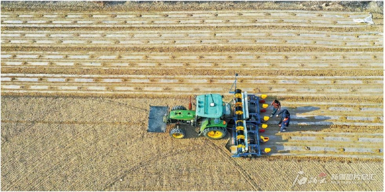 3月28日,在精河縣大河沿子鎮(zhèn)呼和哈夏南村棉田,棉農(nóng)駕駛裝有北斗衛(wèi)星導(dǎo)航系統(tǒng)的大型播種機(jī)播種棉花。