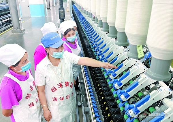 技術(shù)人員在克州潤(rùn)華紡織科技有限公司紡織車(chē)間對(duì)新員工進(jìn)行實(shí)操培訓(xùn)(5月6日攝)。該企業(yè)總投資13.3億元,項(xiàng)目分3期建設(shè),首期項(xiàng)目于2022年7月投產(chǎn),已吸納當(dāng)?shù)?50多人就業(yè)。