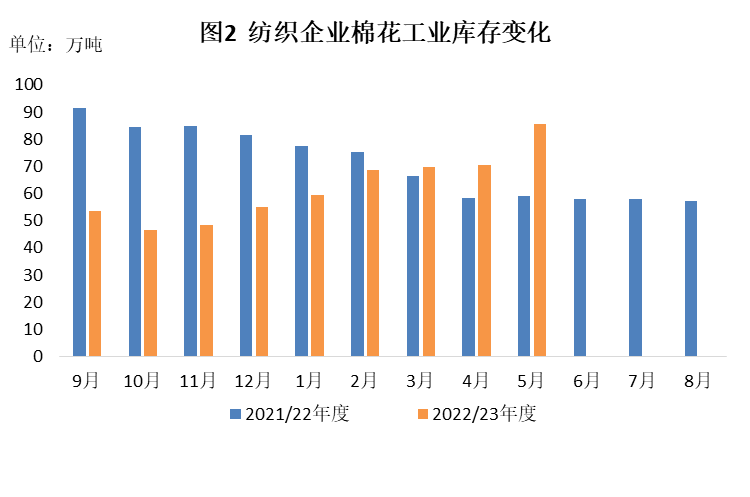 5月以來紡織廠短期訂單仍充足,開機(jī)率基本保持穩(wěn)定,月內(nèi)棉價走勢較強(qiáng),企業(yè)多逢低適量補(bǔ)庫,總體原料庫存有所增加。截至5月31日,紡織廠在庫棉花工業(yè)庫存量為85.44萬噸,較上月底增加14.88萬噸,同比增加26.43萬噸。其中:28%企業(yè)減少棉花庫存,37%增加庫存,35%基本保持不變。
