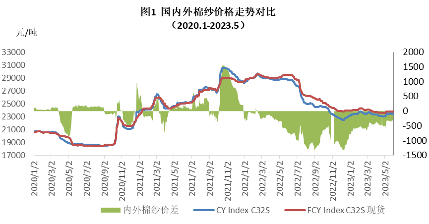 本月內(nèi)外棉紗價格略有上漲,國產(chǎn)32支純棉紗5月均價23419元/噸,較上月上漲283元,漲幅1.22%,較去年同期下跌5393元,跌幅18.7%;進(jìn)口32支純棉紗5月均價23770元/噸,較上月上漲172元,漲幅0.73%,較去年同期下跌5566元,跌幅19%。