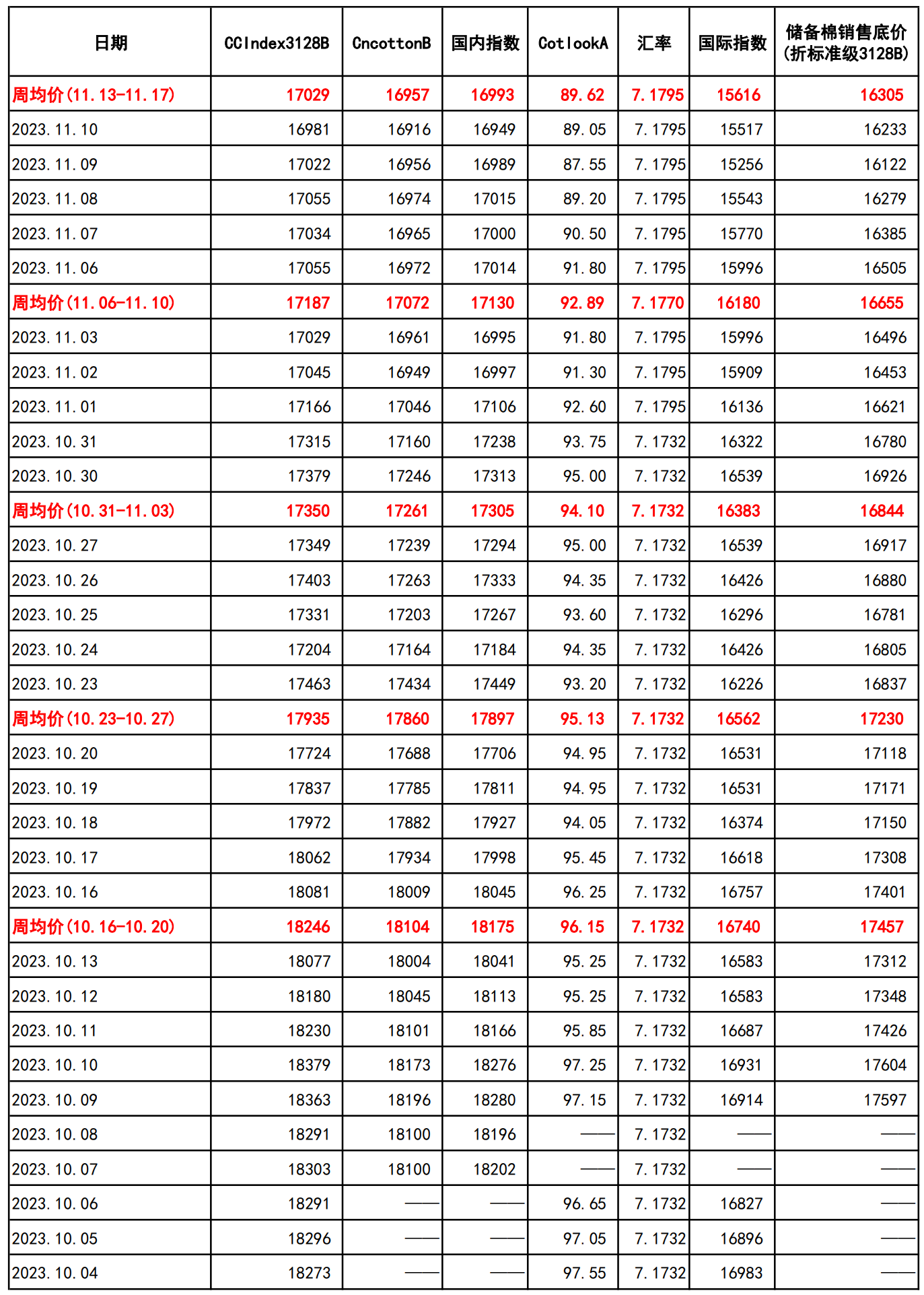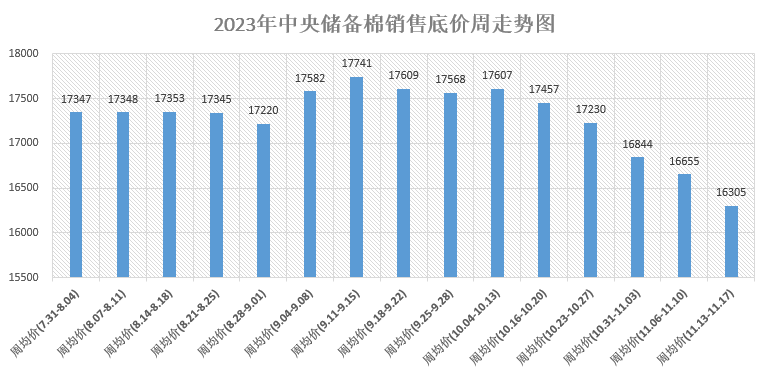 根據(jù)國(guó)家有關(guān)部門要求和2023年中央儲(chǔ)備棉銷售公告,第15周(11月13-17日)儲(chǔ)備棉銷售底價(jià)16305元/噸(折標(biāo)準(zhǔn)級(jí)3128B)。