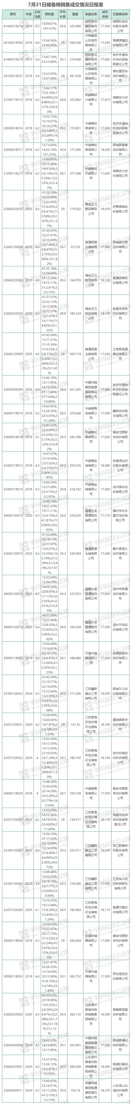 7月31日儲備棉銷售資源10002.705噸,實際成交10002.705噸,成交率100%,成交均價17961元/噸,折3128價格18486元/噸。