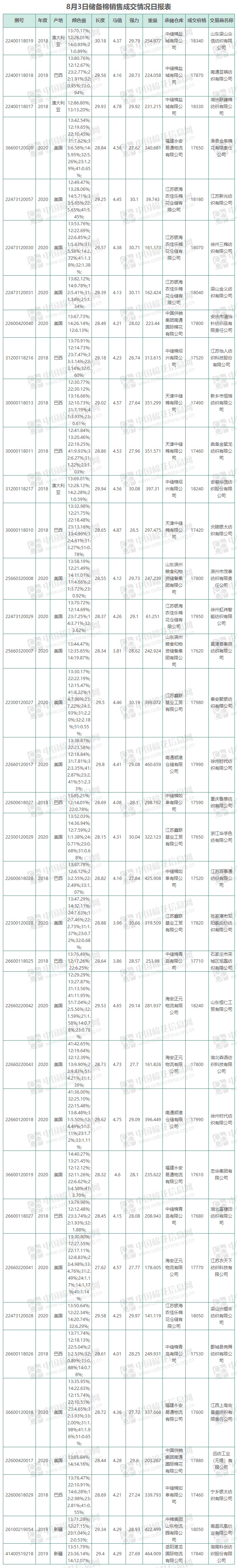 8月3日儲備棉銷售資源10002.3755噸,實際成交10002.3755噸,成交率100%,成交均價17800元/噸,較前一日下降135元/噸,折3128價格18320元/噸,較前一日下降126元/噸。