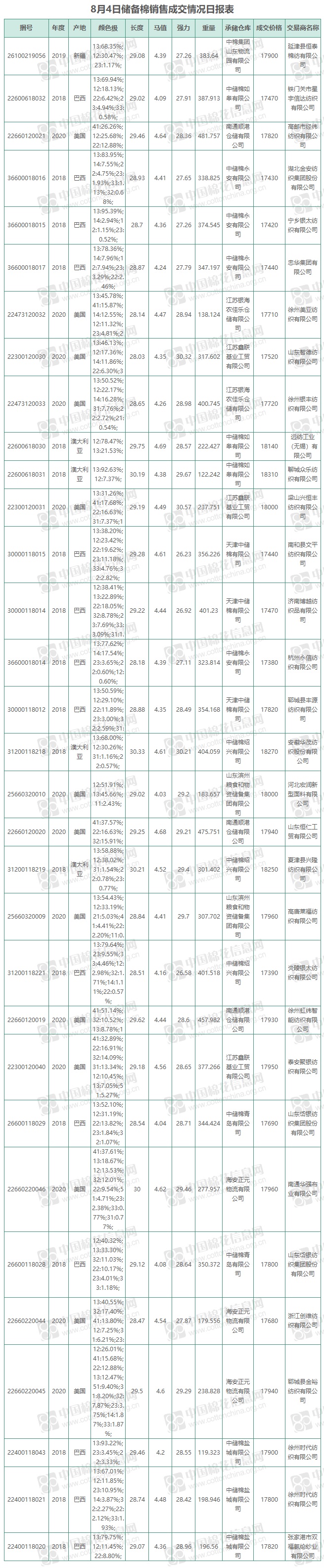 8月4日儲備棉銷售資源10003.5091噸,實際成交10003.5091噸,成交率100%,成交均價17765元/噸,較前一日下降35元/噸,折3128價格18204元/噸,較前一日下降116元/噸。