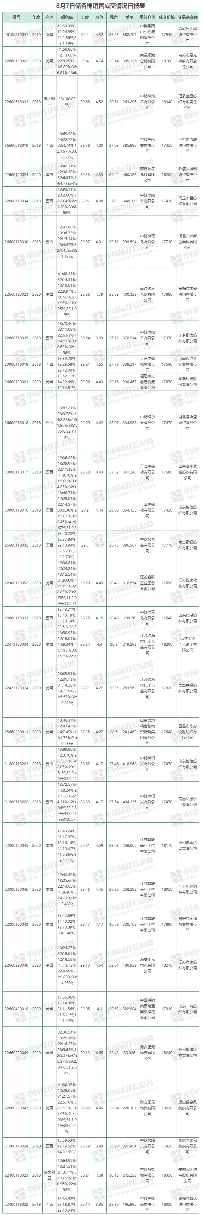 8月7日儲備棉銷售資源10000.9057噸,實際成交10000.9057噸,成交率100%,成交均價17790元/噸,較前一日上漲25元/噸,折3128價格18218元/噸,較前一日上漲14元/噸。
