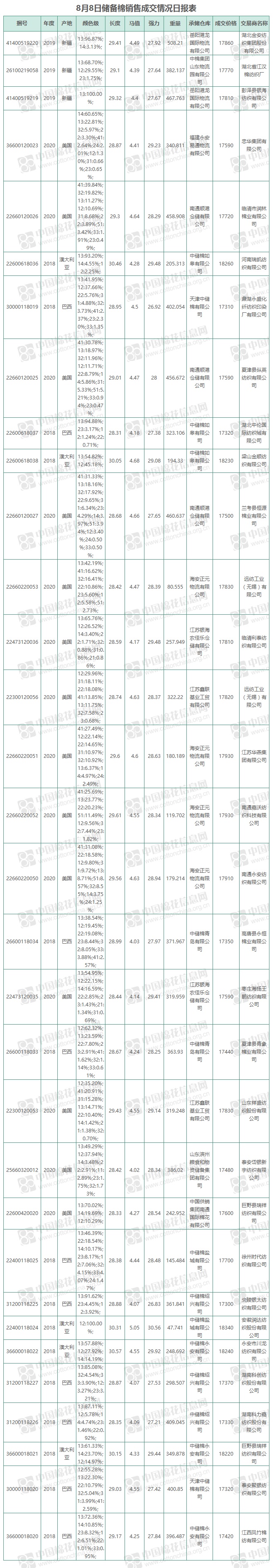 8月8日儲備棉銷售資源10002.3715噸,實際成交10002.3715噸,成交率100%,成交均價17647元/噸,較前一日下跌143元/噸,折3128價格18155元/噸,較前一日下跌63元/噸。