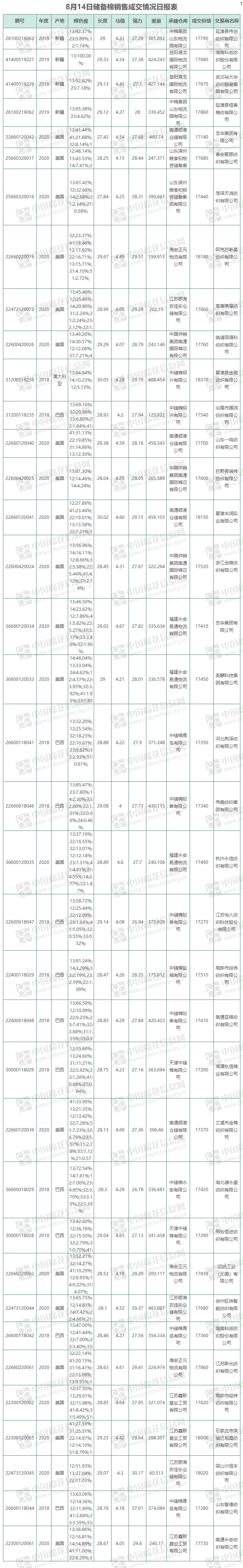 8月14日儲備棉銷售資源12001.3852噸,實際成交12001.3852噸,成交率100%,成交均價17596元/噸,較前一日下跌127元/噸,折3128價格18190元/噸,較前一日下跌105元/噸。