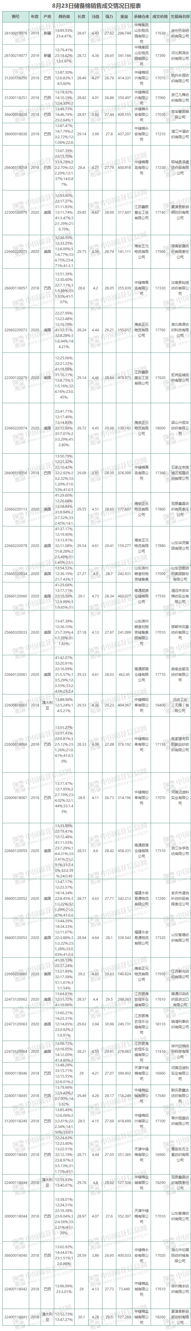 8月23日儲備棉銷售資源12000.1499噸,實際成交12000.1499噸,成交率100%,成交均價17409元/噸,較前一日下跌145元/噸,折3128價格17996元/噸,較前一日上漲4元/噸。