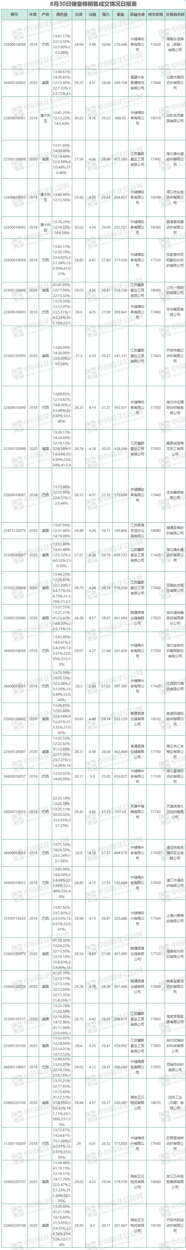 8月30日儲備棉銷售資源12003.5251噸,實際成交12003.5251噸,成交率100%。平均成交價格17712元/噸,較前一日下跌22元/噸,折3128價格18385元/噸,較前一日上漲67元/噸。