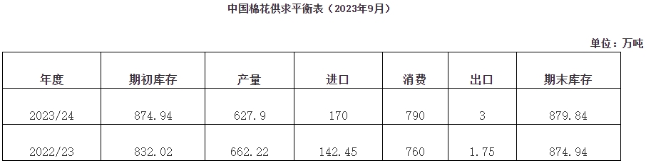 2023/24年度,隨著我國國民經(jīng)濟持續(xù)恢復,棉花消費將持續(xù)回升,據(jù)中國棉花協(xié)會預計,2023/24年度我國棉花消費量恢復至790萬噸,同比增長4%;產(chǎn)量約627.9萬噸,同比下降5.2%;進口170萬噸,同比增長19.3%;期末庫存879.8萬噸,同比增長0.6%。