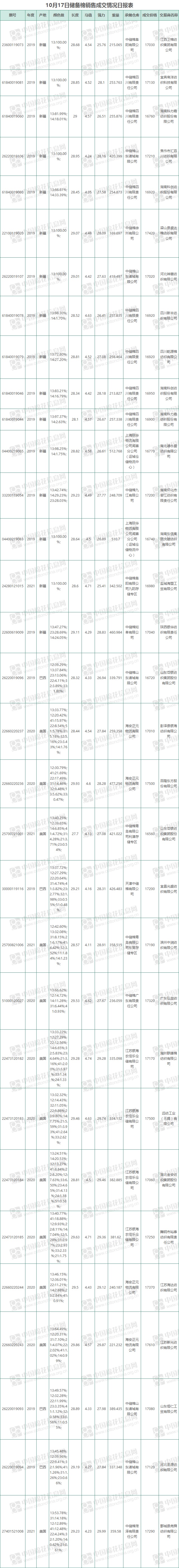 10月17日儲備棉銷售資源20002.734噸,實際成交10550.2978噸,成交率52.74%,成交均價17075元/噸,較前一日下跌152元/噸,折3128價格17613元/噸,較前一日下跌29元/噸。